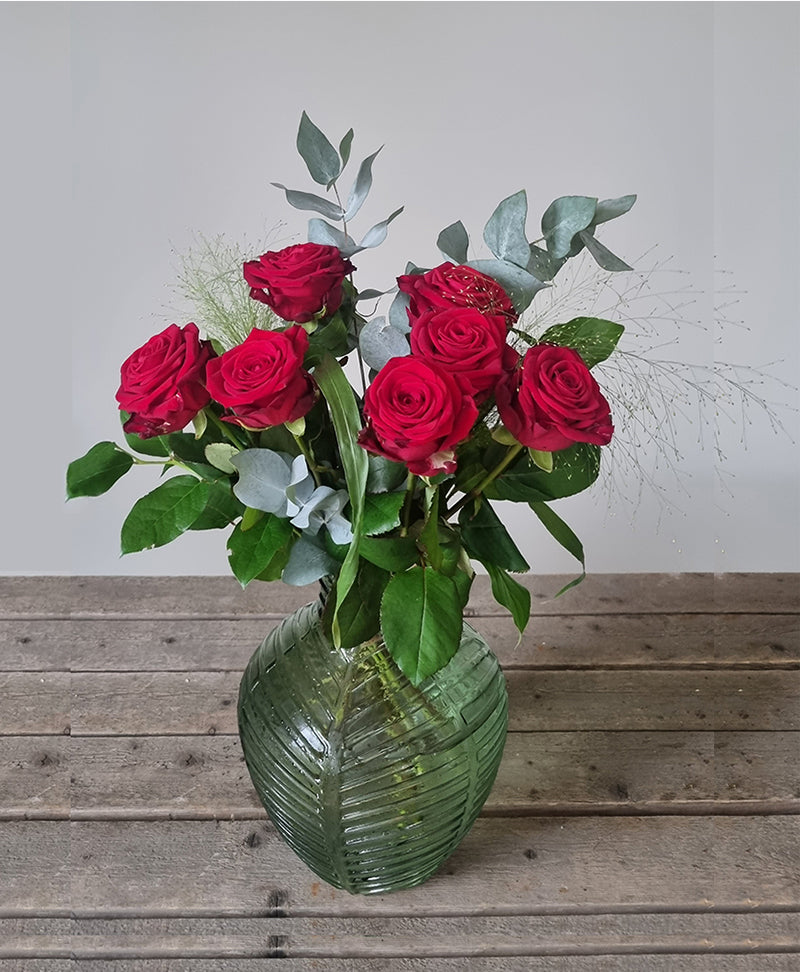 Förklarar dina känslor för den du älskar med en magisk rosbukett med 7 stycken vackra röda rosor och fint grönt.
