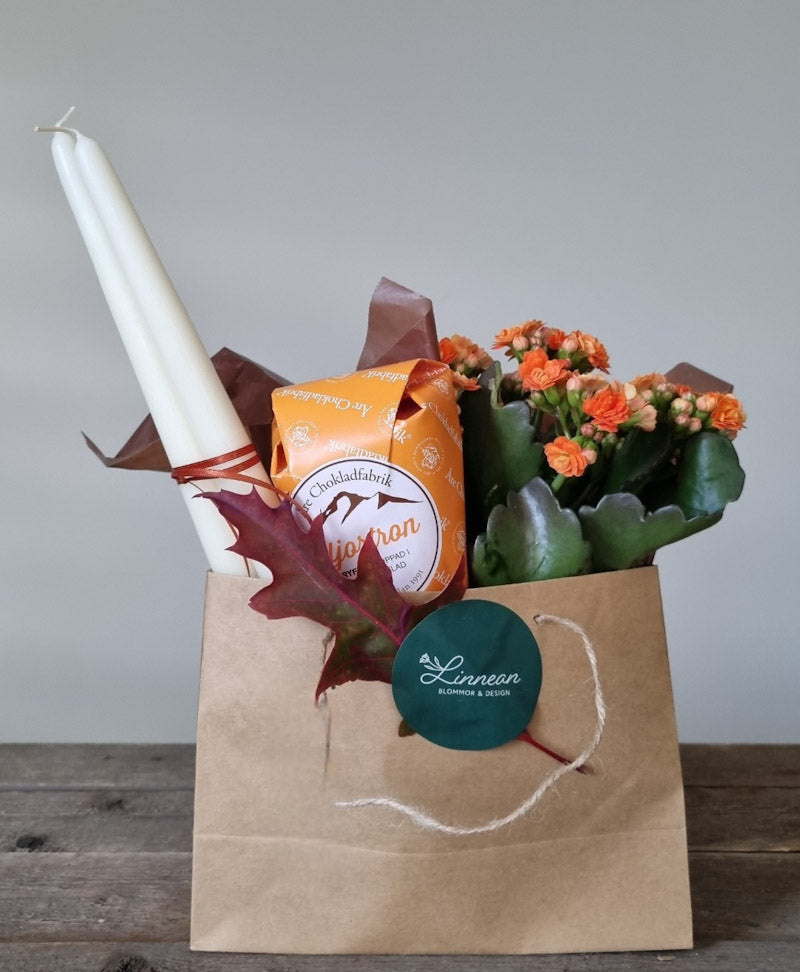 Presentpåse med Calandiva, två stycken kronljus och en chokladstrut