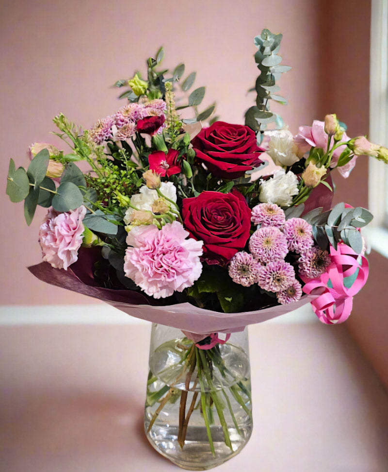 Rosor, Prärieklocka, Nejlikor och Santini i en kärleksfull bukett som passar lika bra till livets största kärlek som bästa vännen.