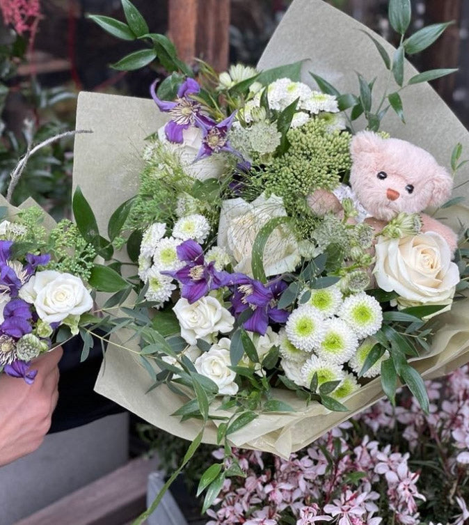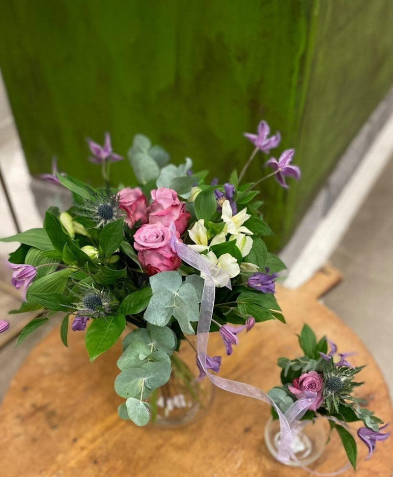 En fin bukett för att fira att ett barn kommit till världen. Familjebuketten är två buketter, en stor och en liten som sitter ihop i ett band som symboliserar navelsträngen.