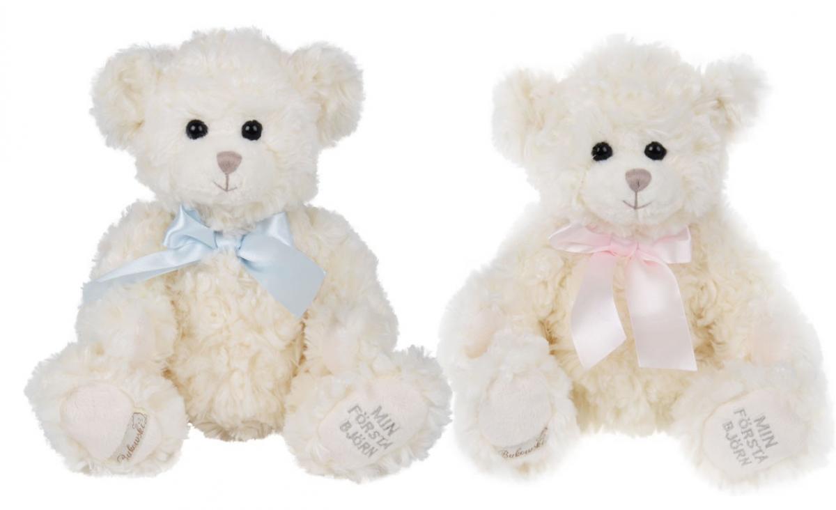 • Välj om du vill ha med rosa eller blå nalle eller ingen nalle. Nallen är från Bukowski och följer den Europeiska säkerhetsstandarden. Den har en rosa eller en blå rosett kring halsen och texten min första björn på foten. Men är i övrigt en vit fluffig söt nalle.