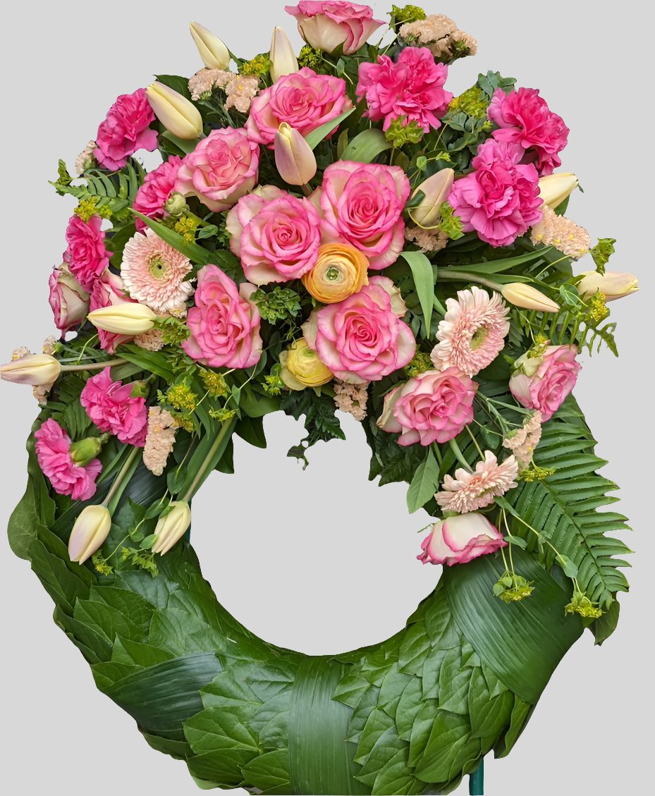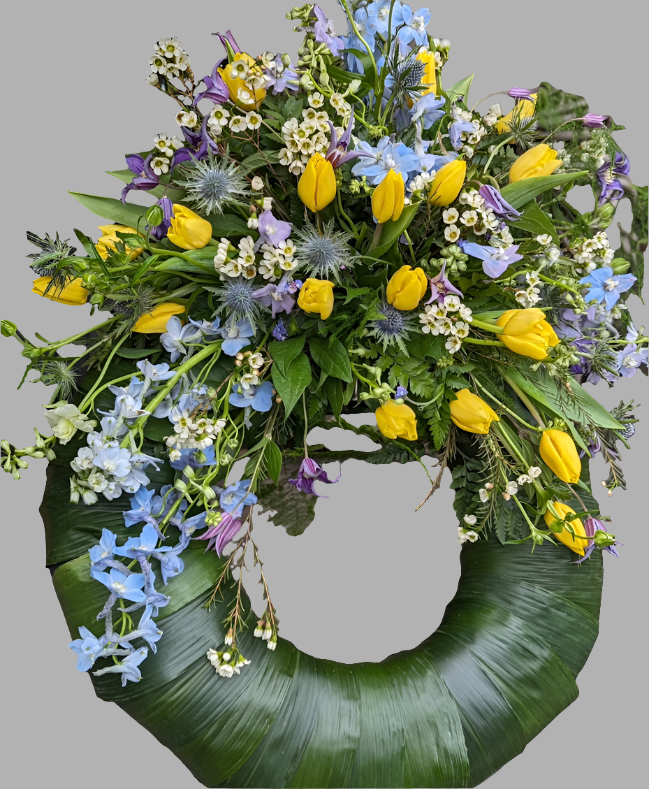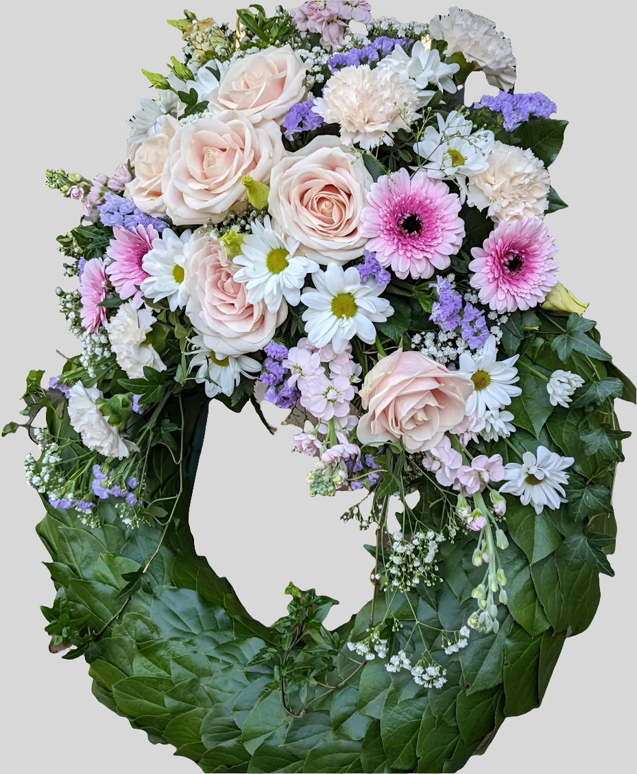 Här ser du bilder på olika kransar som kan ge dig inspiration. Du kan välja bland fem olika färg kombinationer men på webben kan du inte välja blommor. Vi skapar kransen i de färger du valt i säsongens vackra blommor.