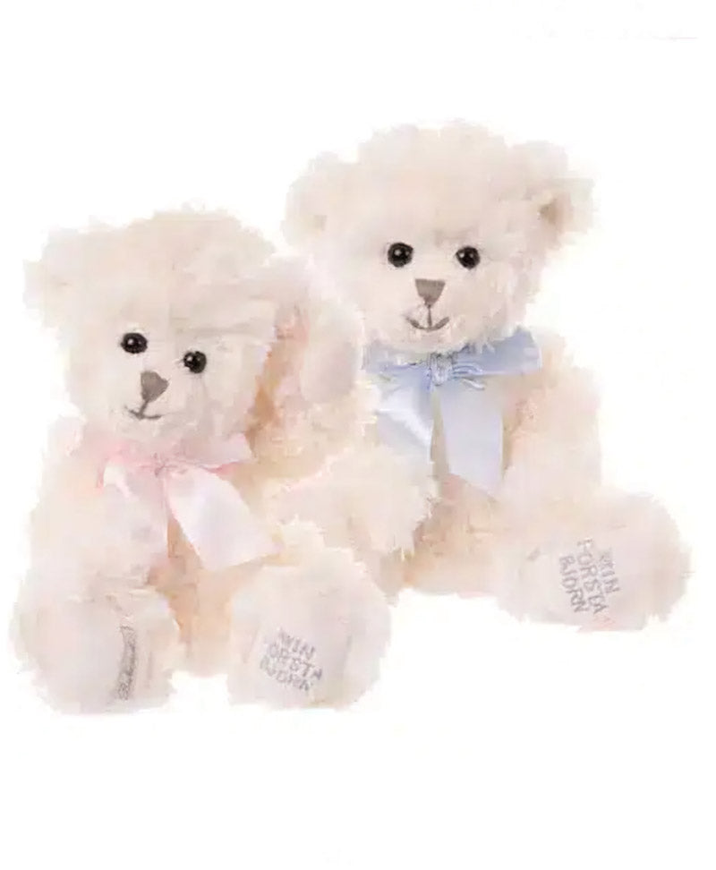 Vit Nalle med antingen en blå rosett eller en rosa rosett kring halsen. Från Bukowski.
