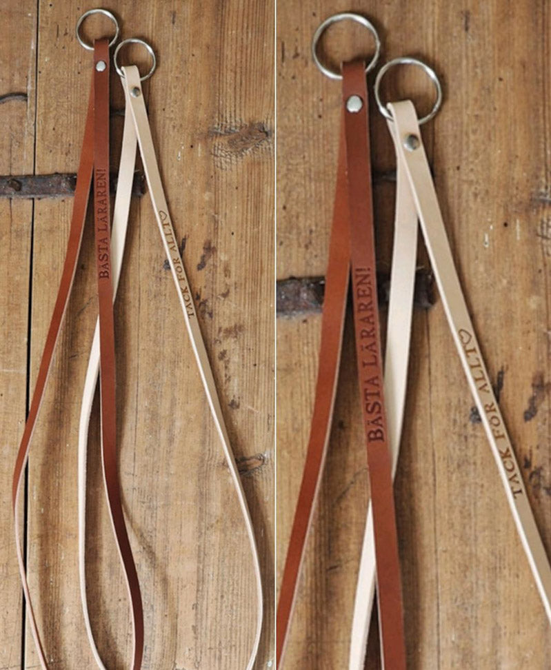 Ett långt nyckelband att hänga runt halsen i ljust eller brunt läder