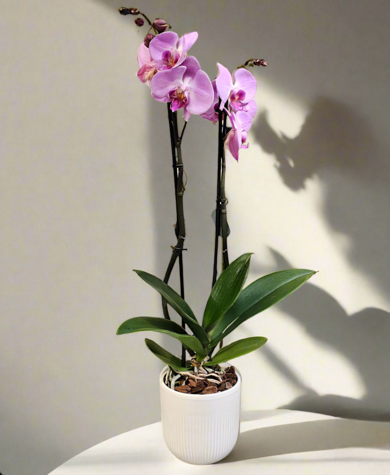 Tvåstänglad lila orkidé och matchande kruka i keramik.