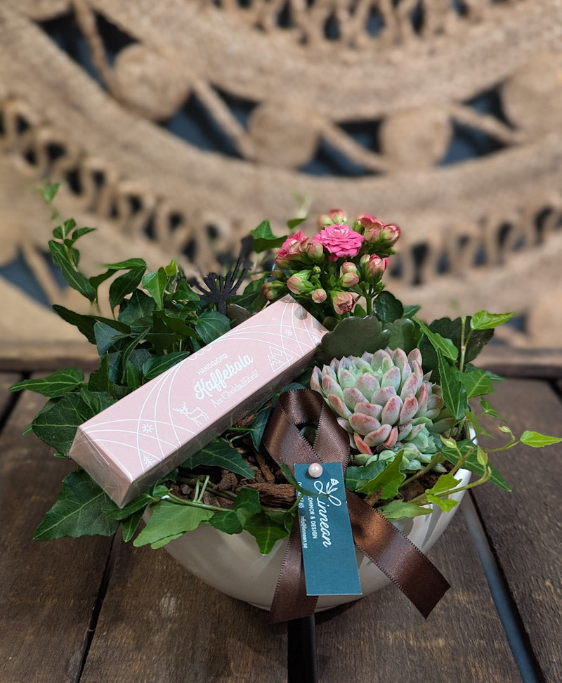 Plantering i keramikskål med kola från Åre Chokladfabrik