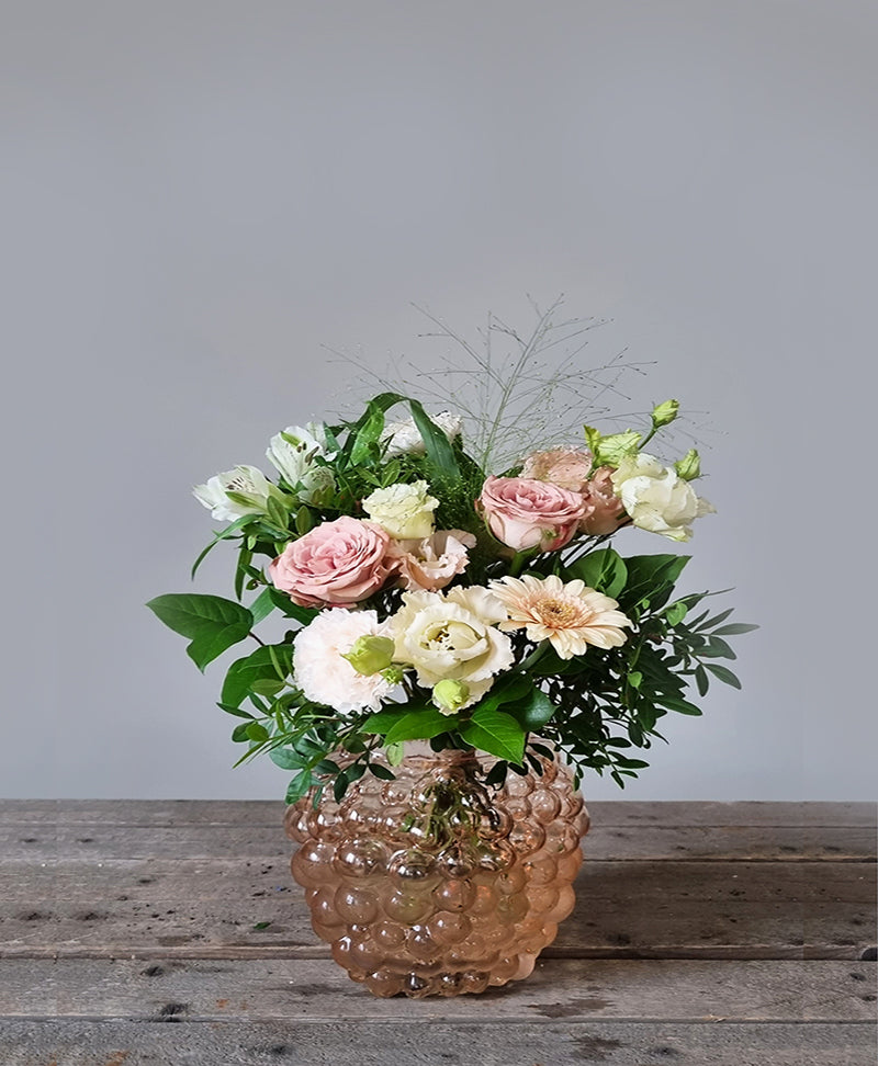 Vördnadsfull och ljus bukett i vitt, creme och rosa.
