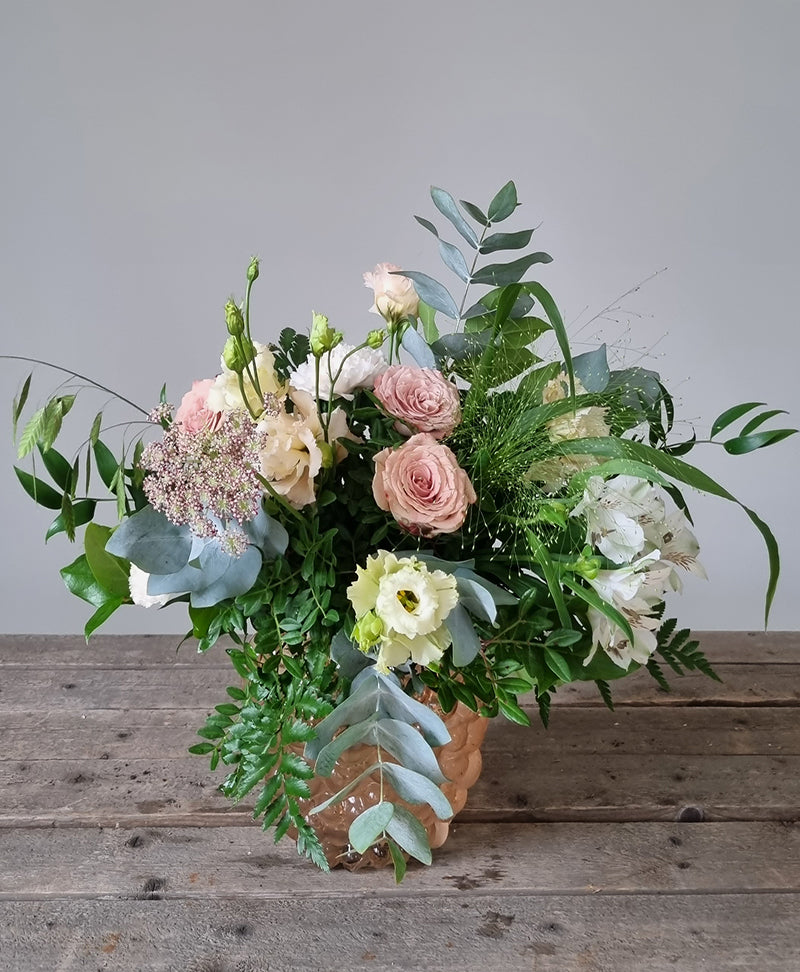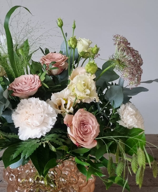 Vördnadsfull och ljus bukett i vitt, crème och rosa.