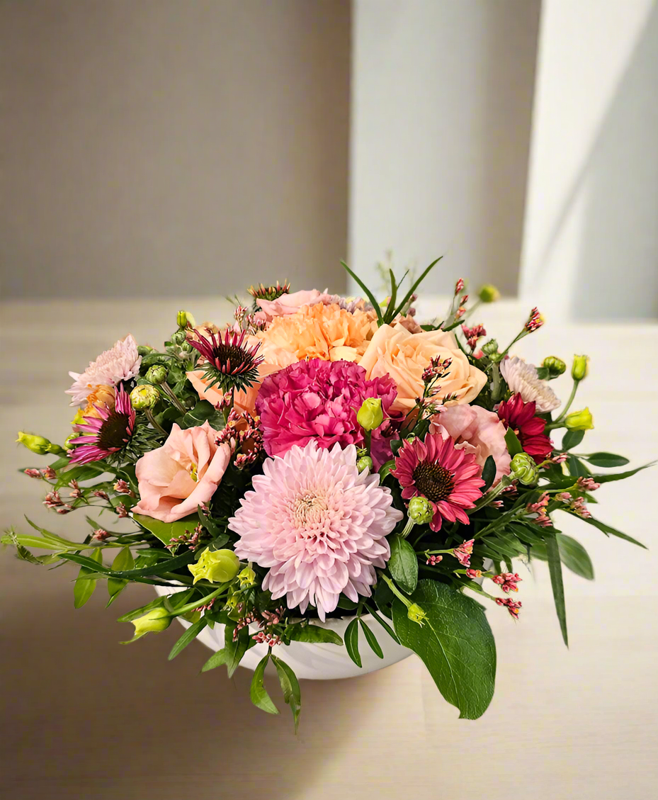 Skål i keramik med snittblommor i stickmassa. Lätt att placera, lätt att sköta om genom att se till att fylla skålen med vatten.