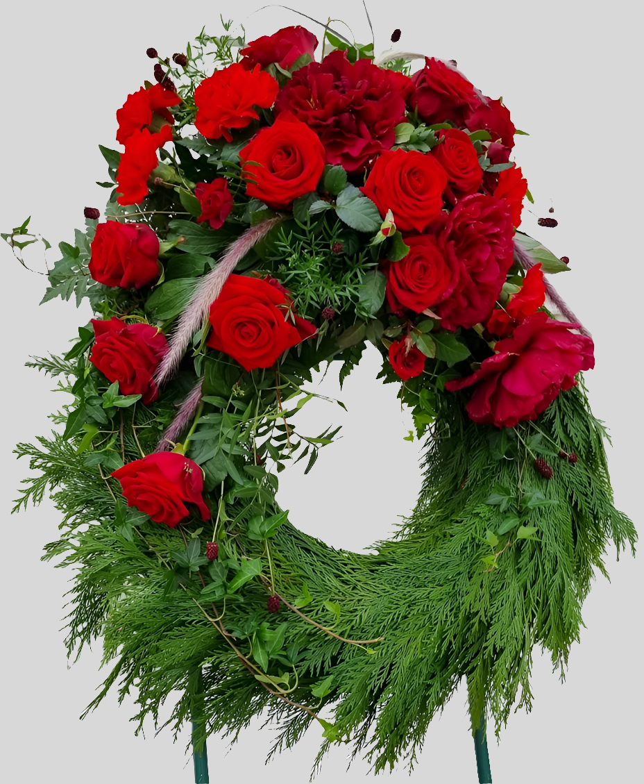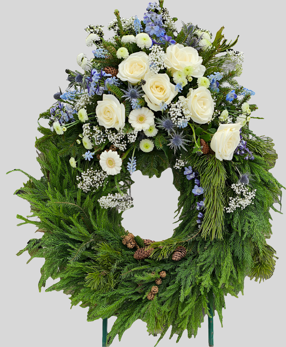 Här ser du bilder på olika kransar som kan ge dig inspiration. Du kan välja bland fem olika färg kombinationer men på webben kan du inte välja blommor. Vi skapar kransen i de färger du valt i säsongens vackra blommor.