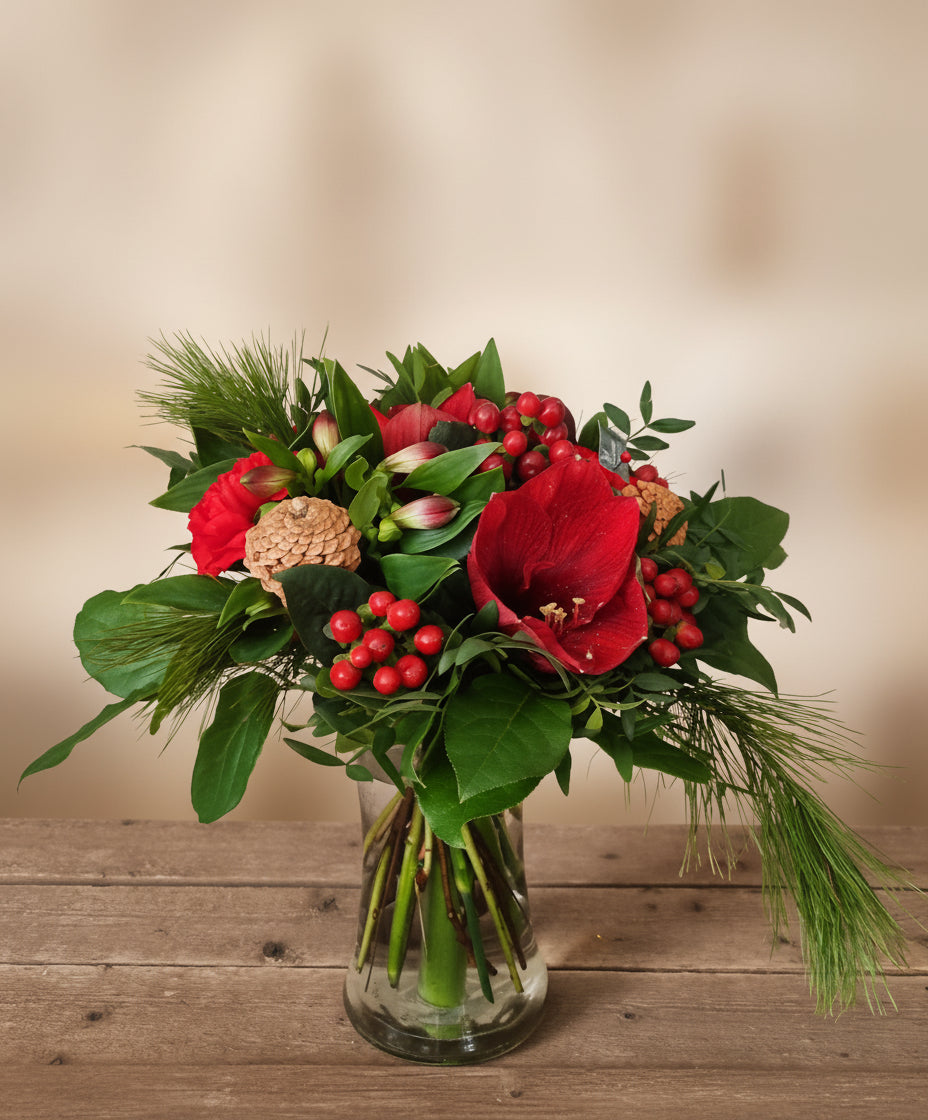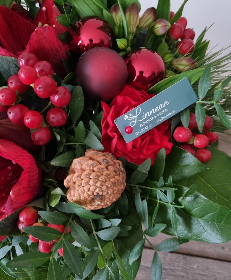 Röd Amaryllis i en bukett med Nejlikor och Amlstromeria. Vackert grönt, kotte och julkulor.