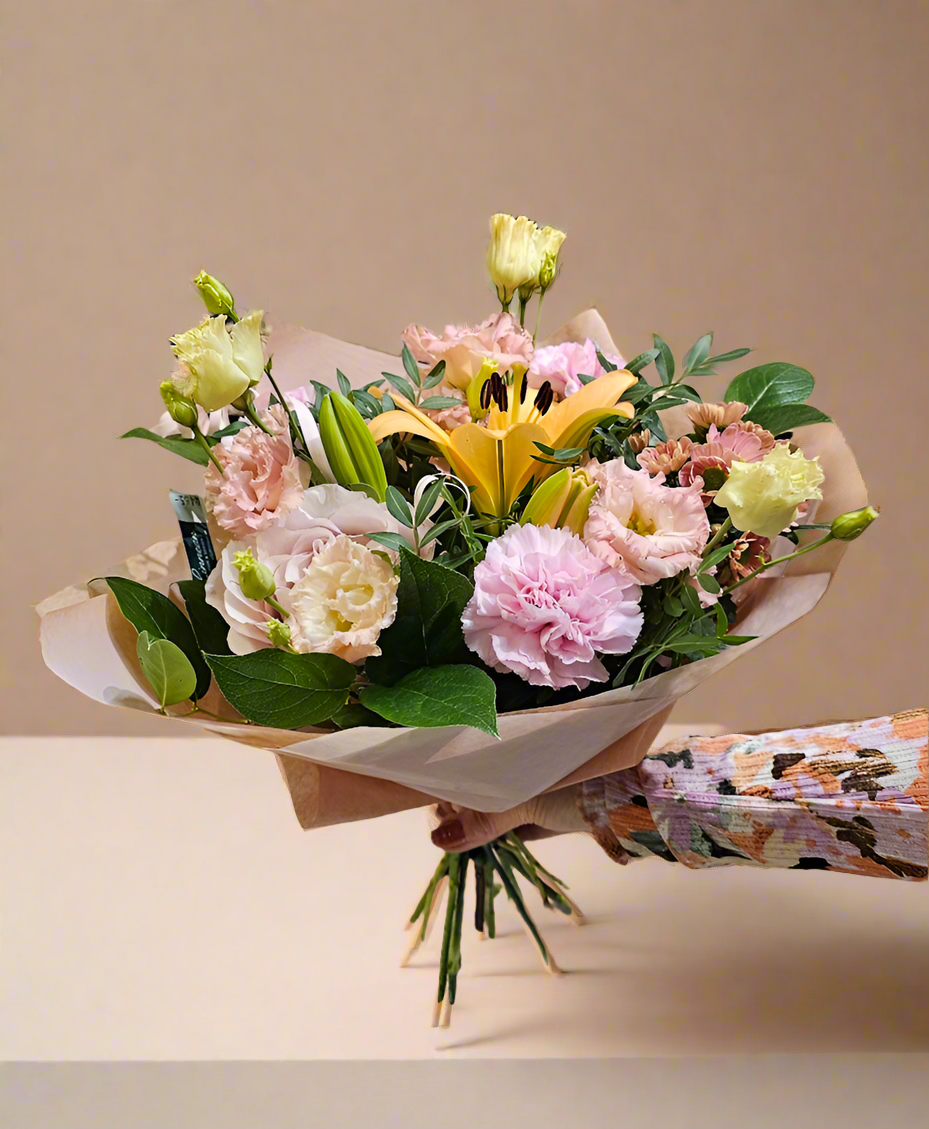 Aprikosa och gula toner som påminner oss om vårsolen. Lilja, ros, nejlikor och prärieklocka.