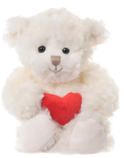 Vit söt nalle som håller i ett rött hjärta. Från Bukowski.